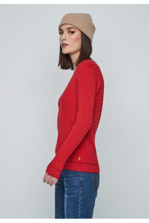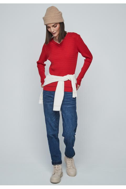 V-neckline braids woman sweater detail stitches and long sleeve