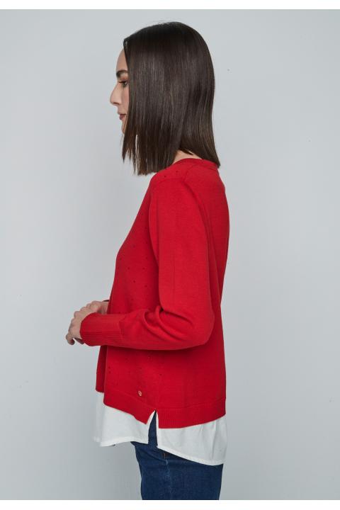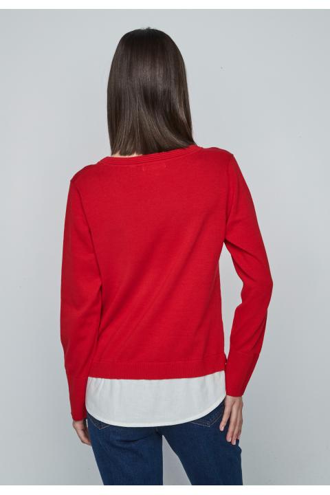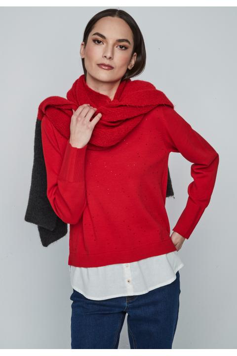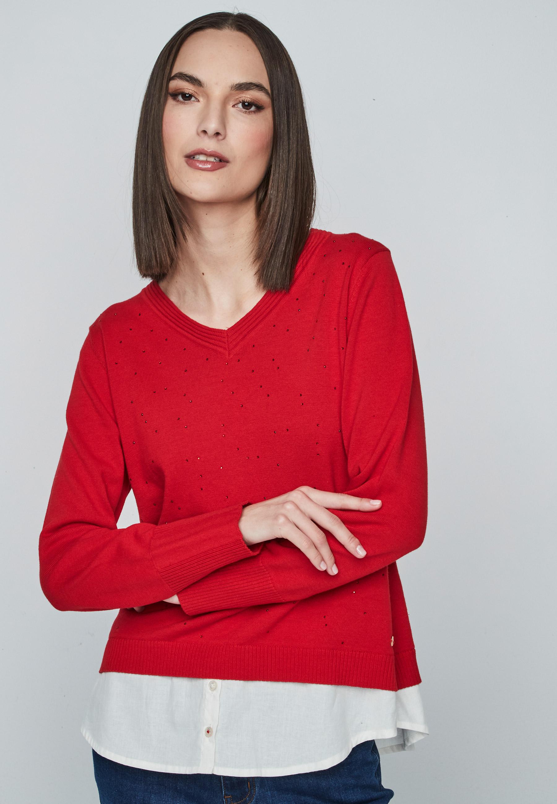 V-neckline strass woman sweater with shirt bottom and long sleeve