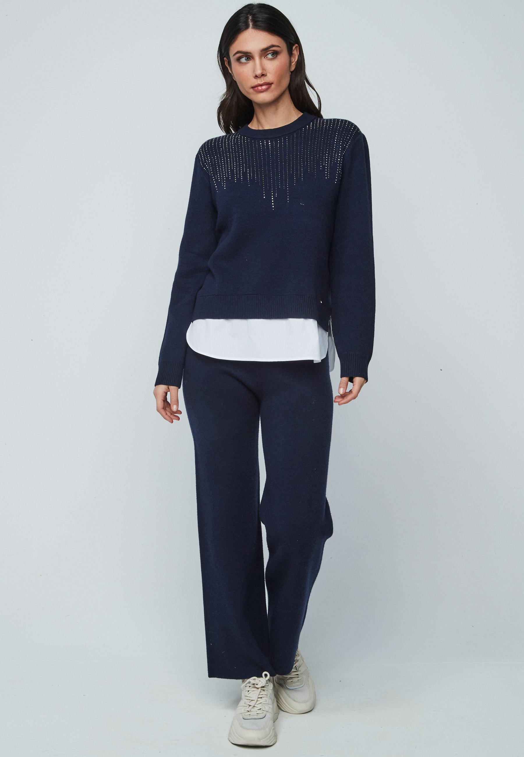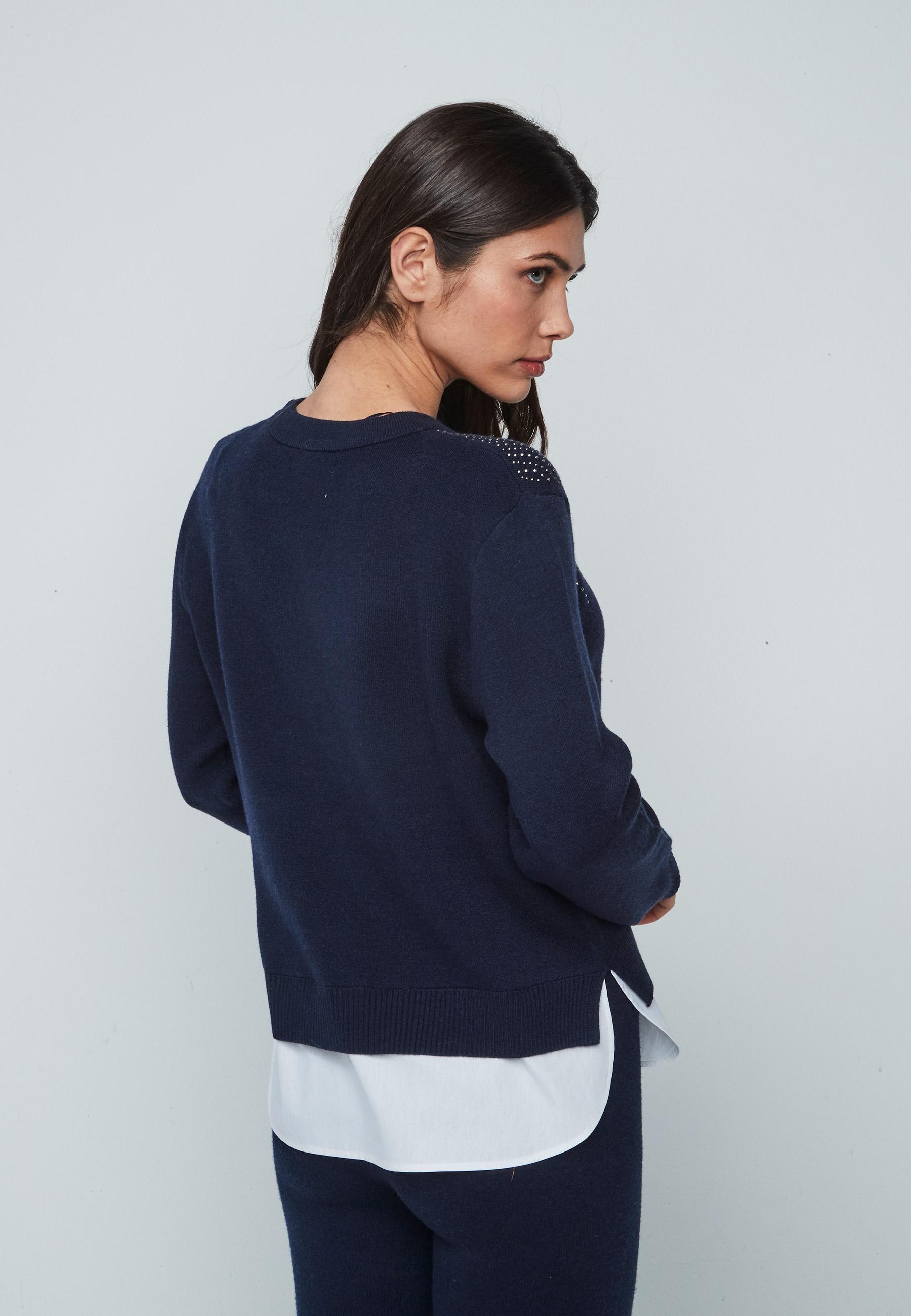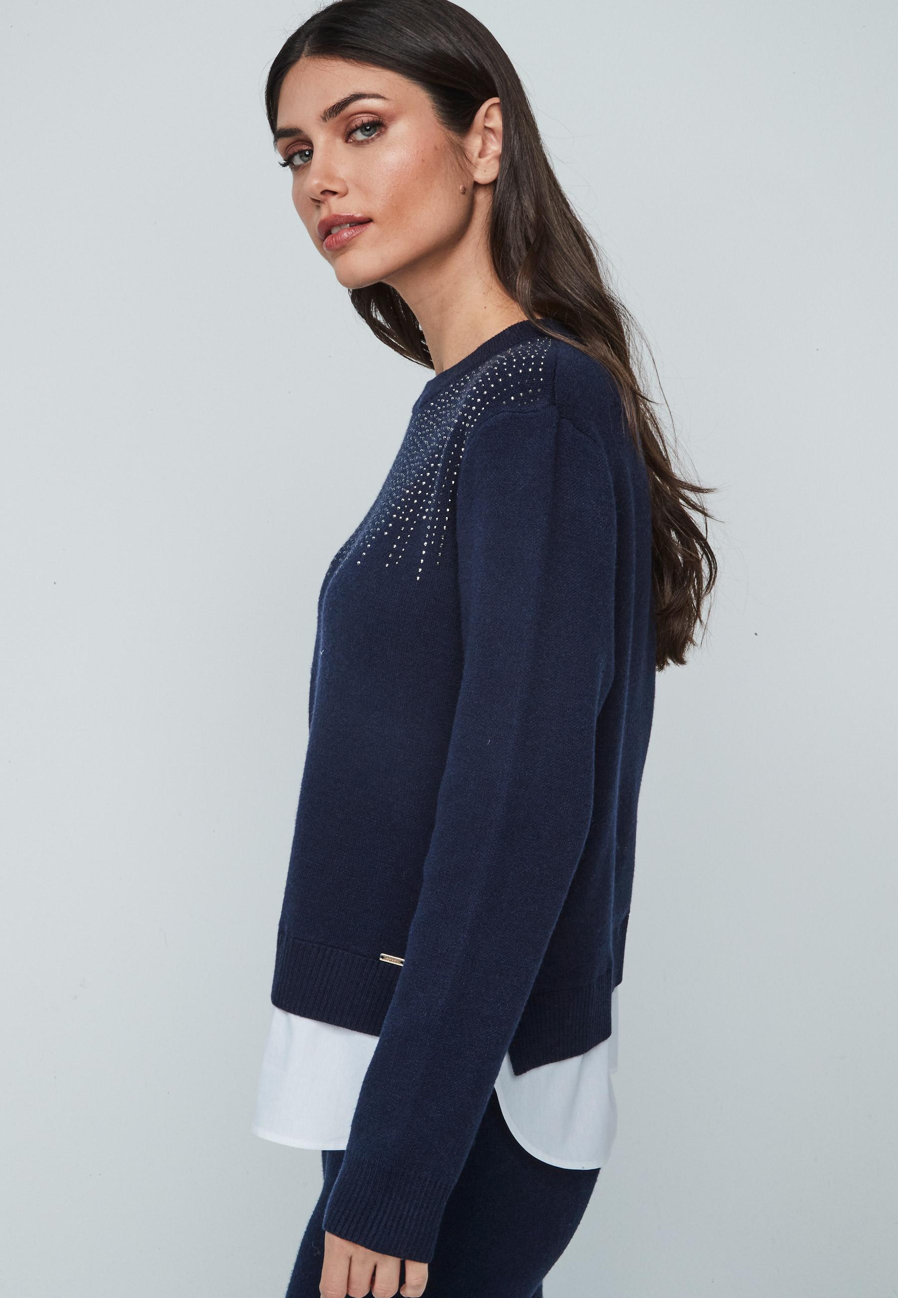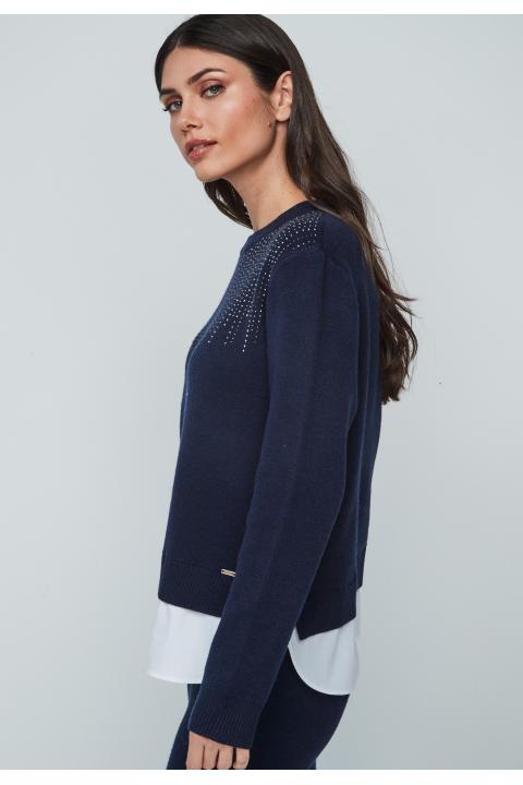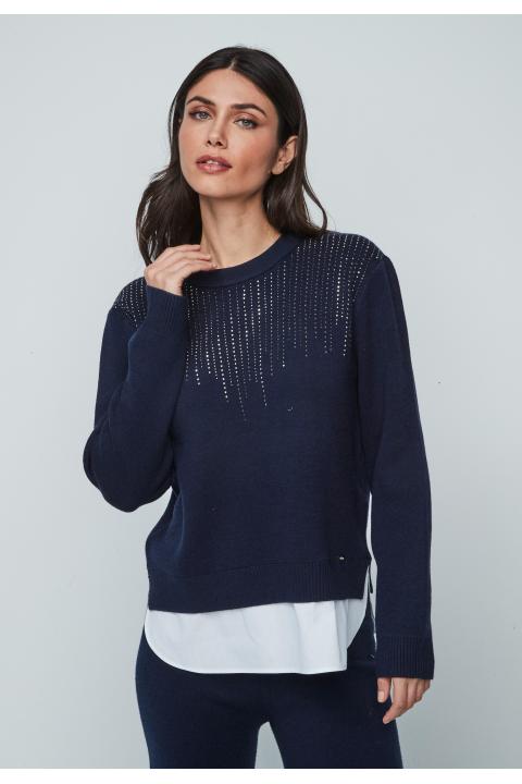 Round neckline strass woman sweater with shirt bottom and long sleeve