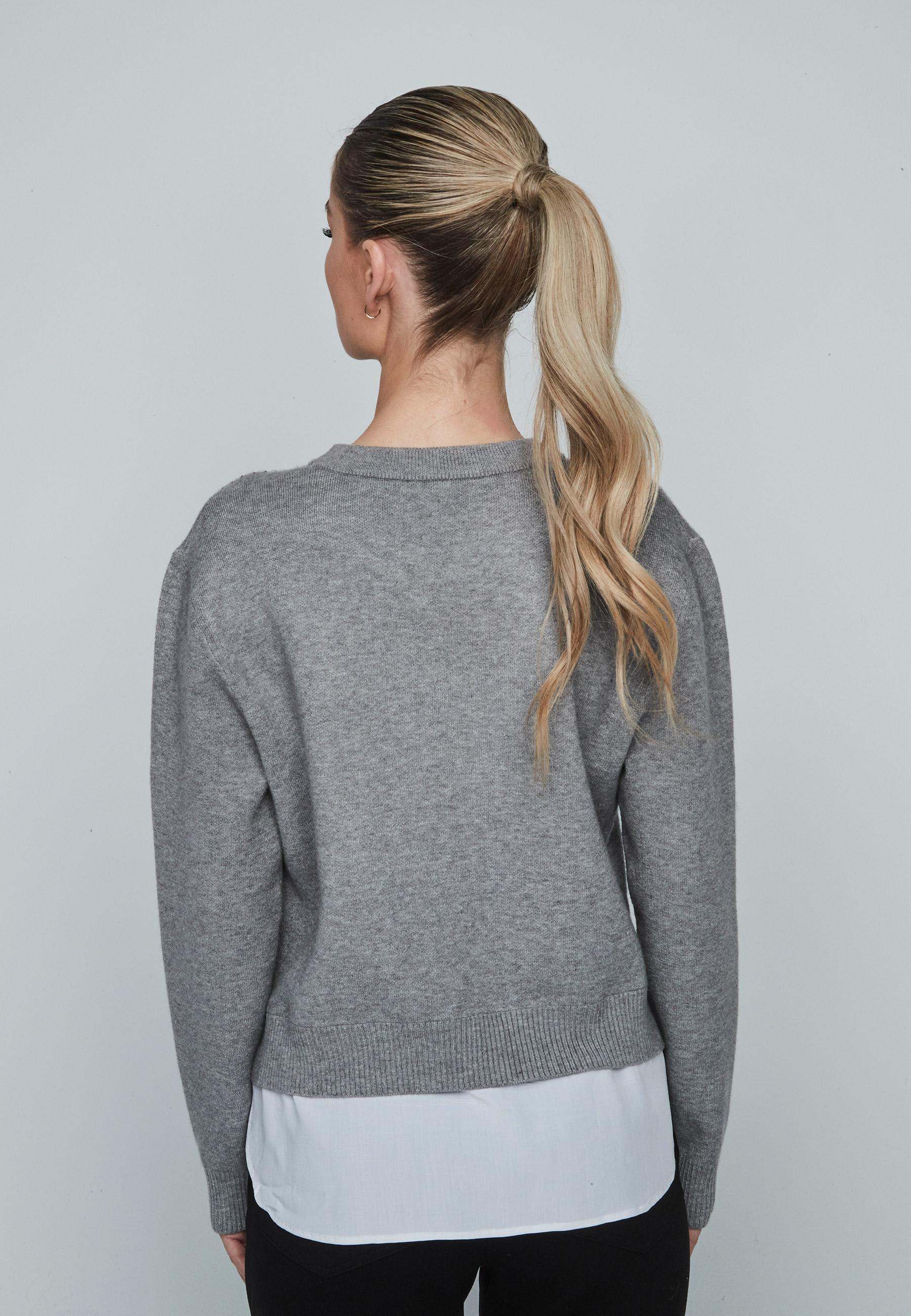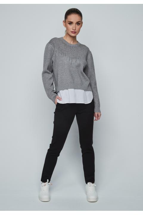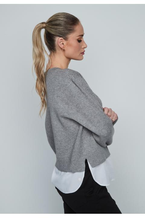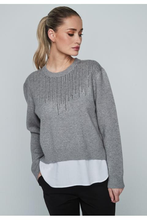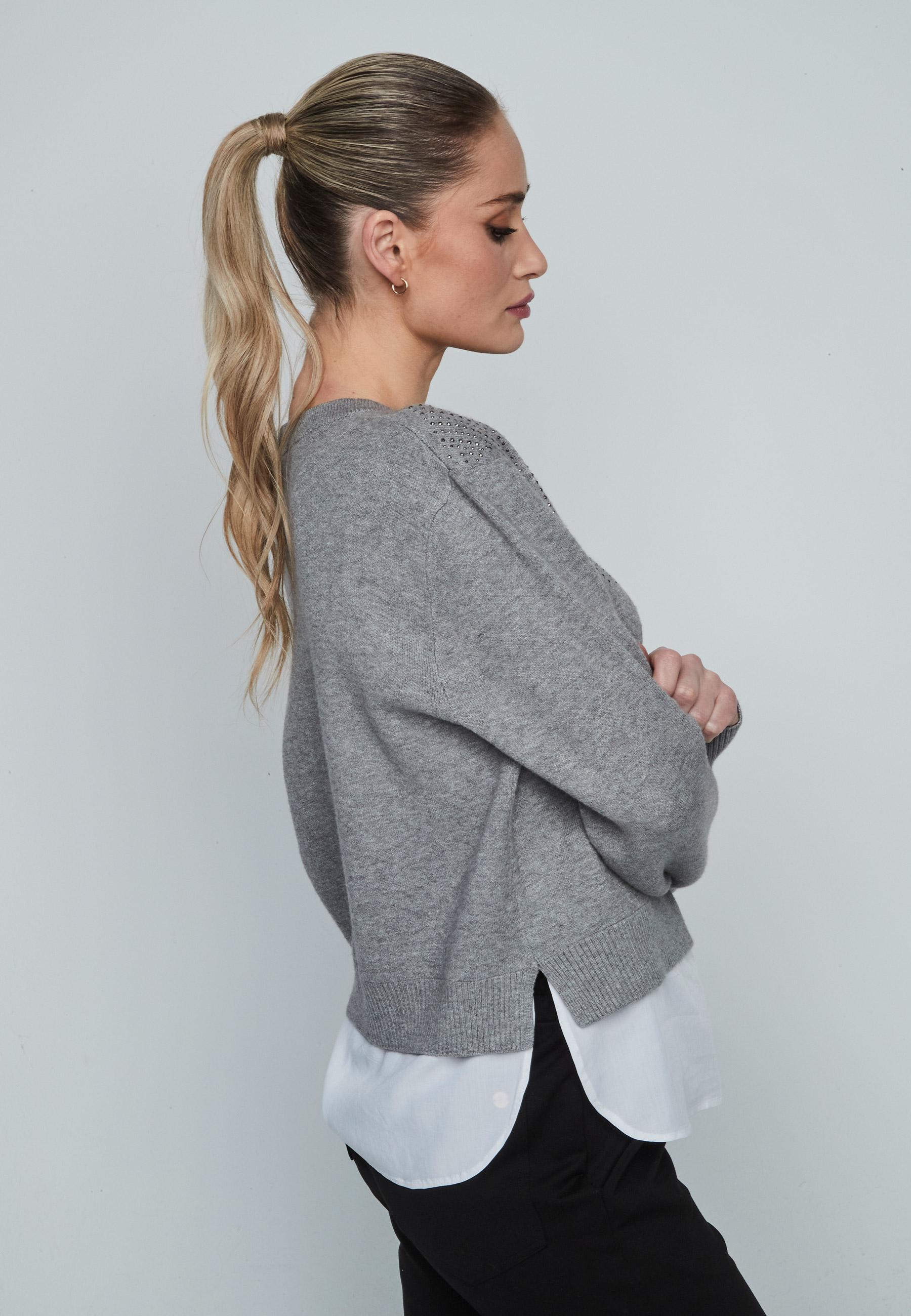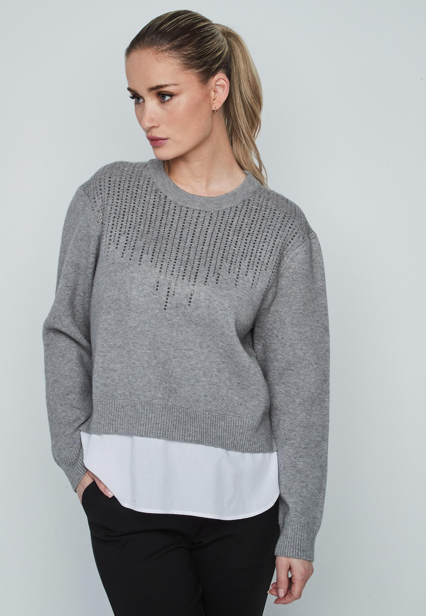 Round neckline strass woman sweater with shirt bottom and long sleeve