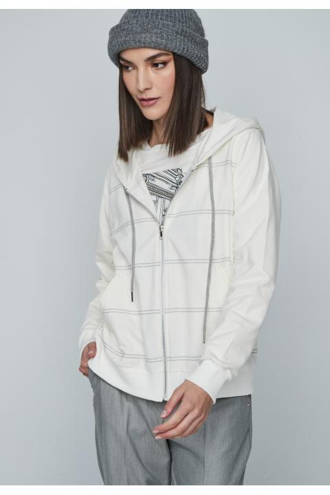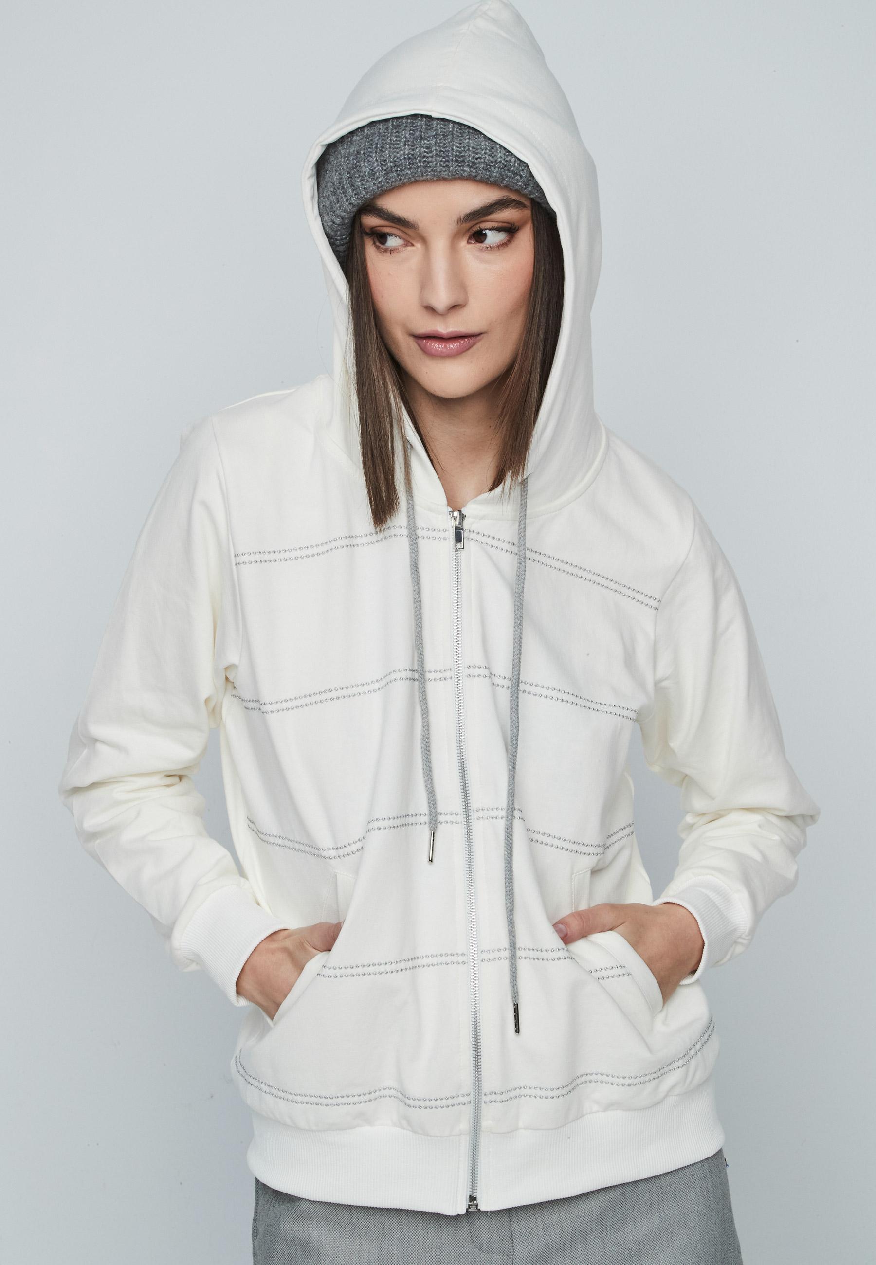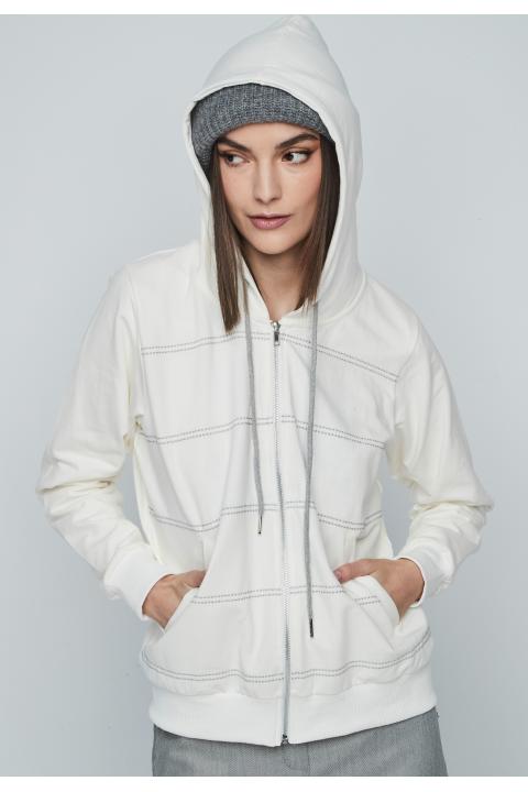 Hood stripped sweatshirt front zipper closed and long sleeve