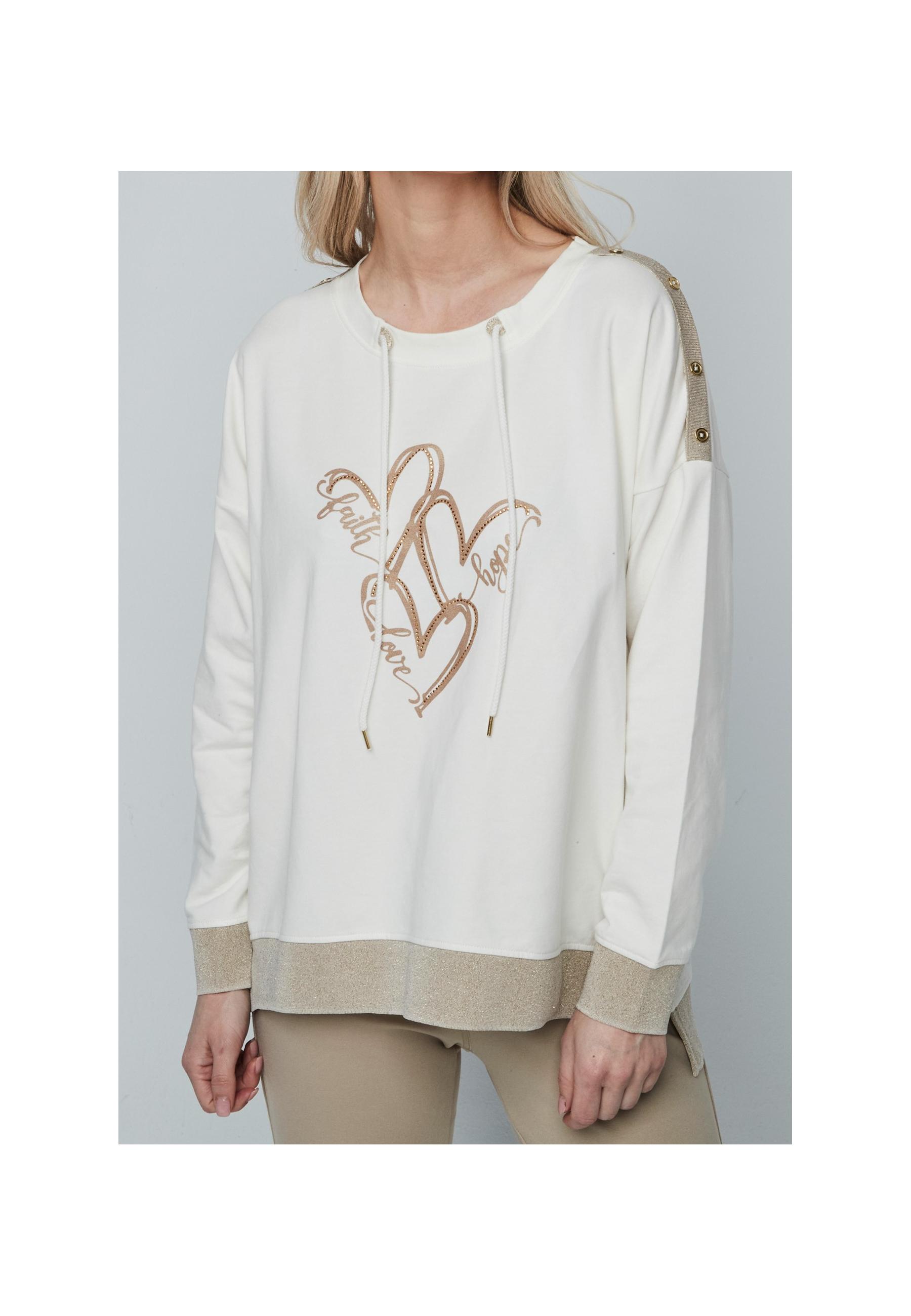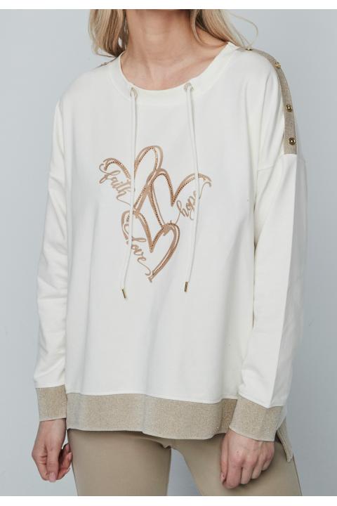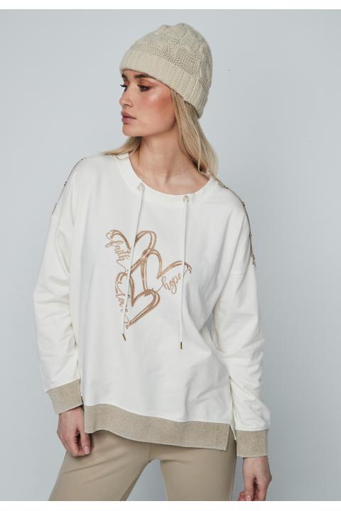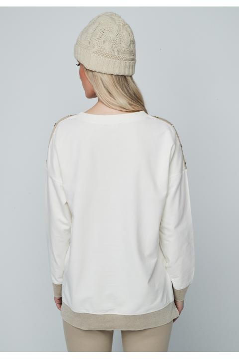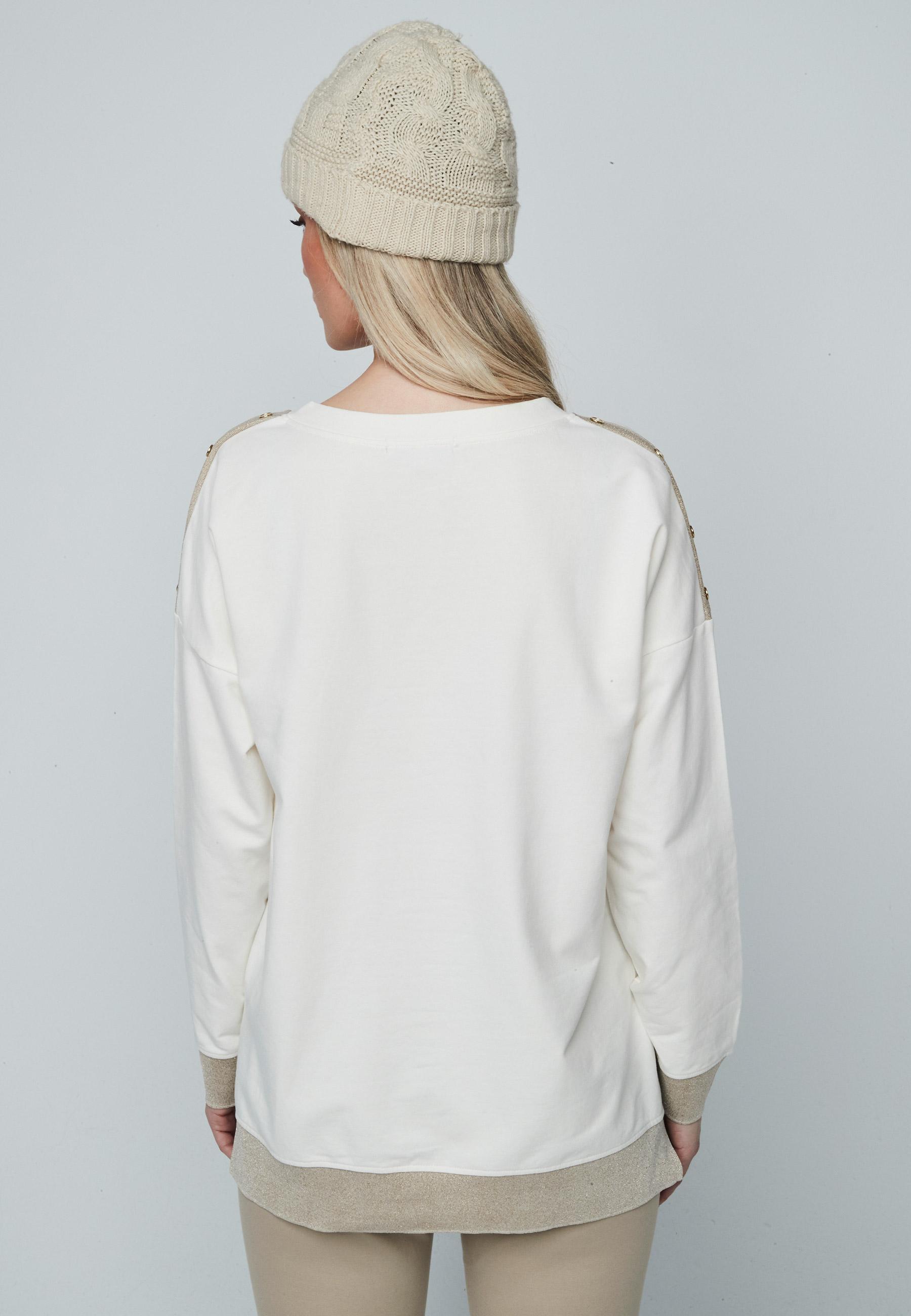 Round neckline woman sweatershirt with print, shoulder detail and long sleeve