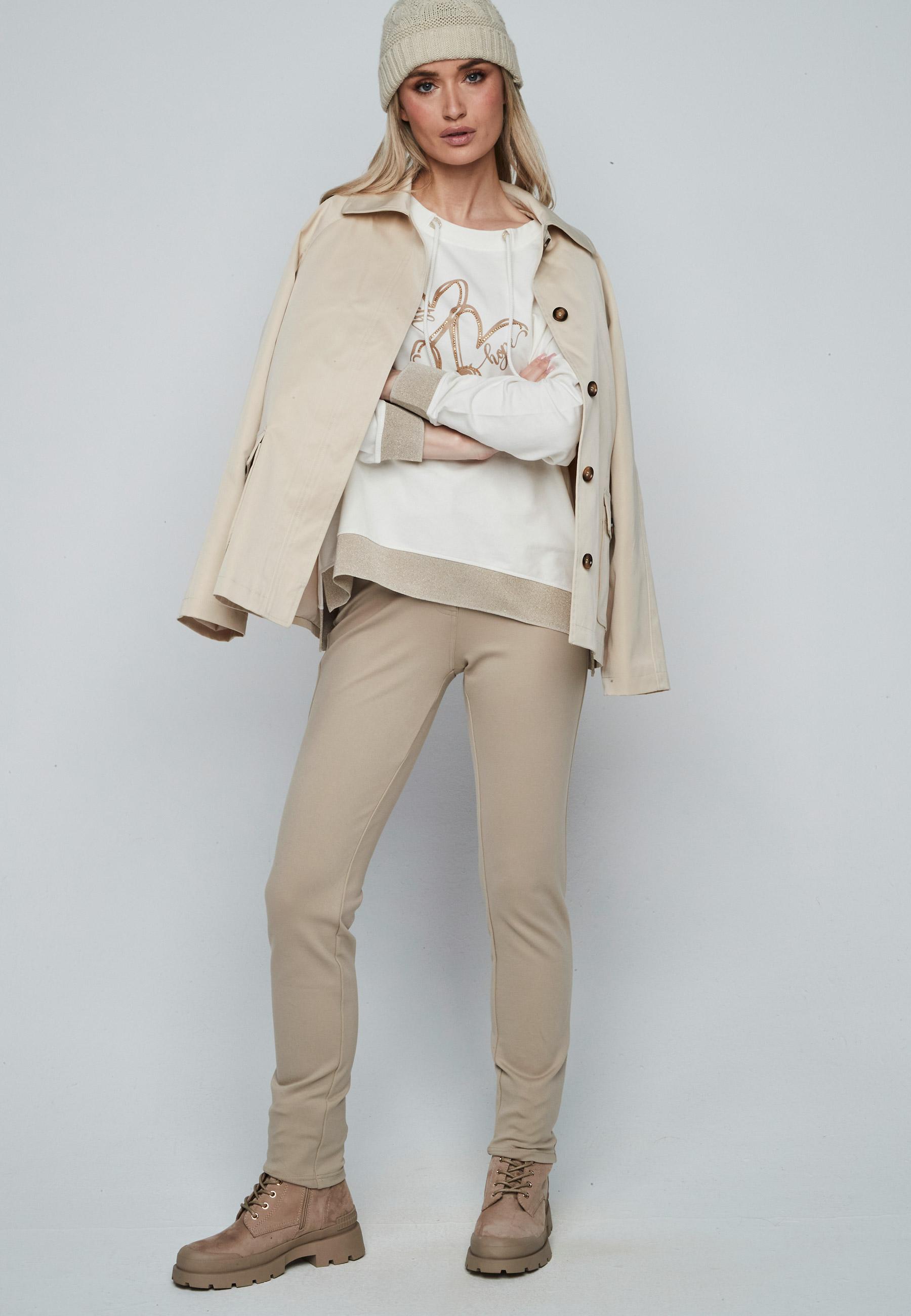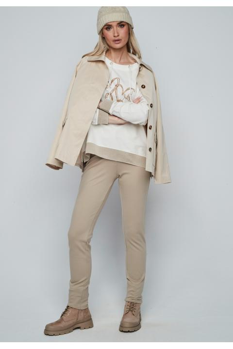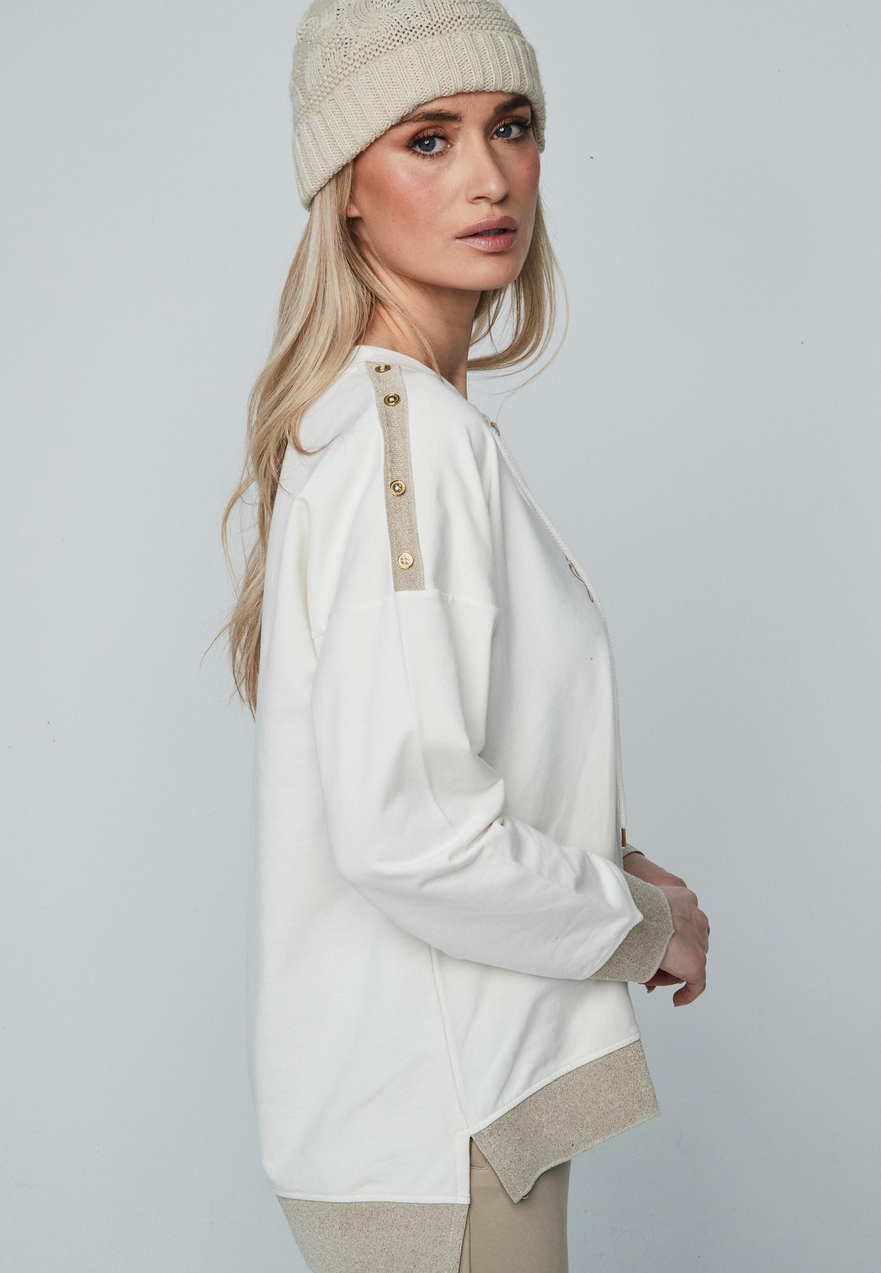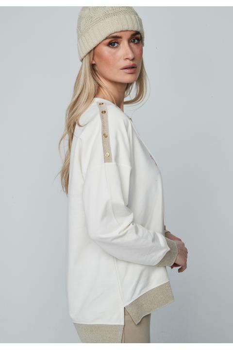 Round neckline woman sweatershirt with print, shoulder detail and long sleeve